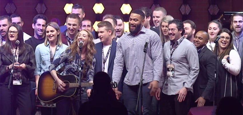 We’re not big on labels, since as creative types we prefer to be iconoclastic. But we all have to hang our hats on something and so we do call ourselves a team building company. The truth is, we help organizations tell their stories through song in many different settings that include interactive conference sessions, motivational keynotes, convention kick-offs, making music videos and yes, multi-team events with song competitions.